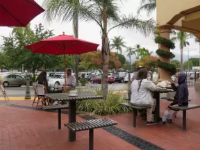 Upscale, colorful plaza in farmhouse style, with modern cafes. Kids climb on a huge log. The fire pit is fantastic at night, surrounded by eucalyptus trees.