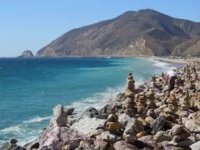 Huge sand dune along Highway 1, plus rock cairns along the ocean across the street.