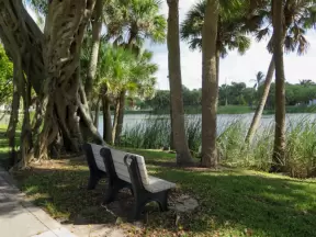 Tropical paradise with amazing trees, soft green grass, and woven huts shading picnic tables with BBQs that line the river, plus bike and kayak rentals. Beware alligators.