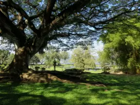 Park with playground surrounded by tropical plants and trees, lawn bowling, and putting green in the center.