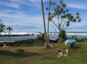 A tiny black sand beach, emerald green springs, grassy knolls, a lifeguard, and warm-water swimming or body boarding.