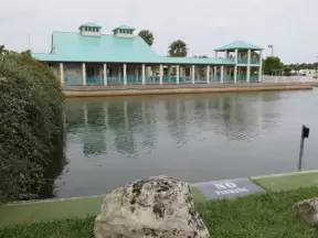 Waterfront park with amazing colors in the water- views of an island and blue-green sandbars. Plenty of benches and docks, and a playground.