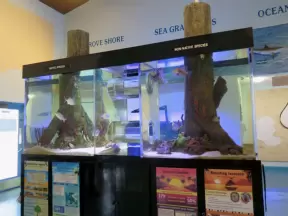 Nature center with sea life in huge tanks (you can't see inside because you are held back by railings), and boardwalk through jungle to observation tower.