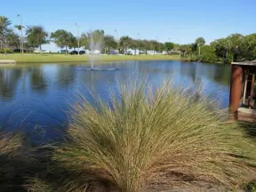 A small playground by a lake with palm trees, picnic pavilion, and some mechanical items to explore such as a diesel engine.