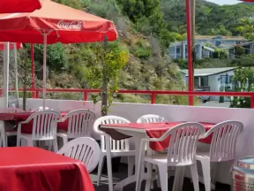 Sit on their rooftop patio under red umbrellas checking out the sea and the hills covered in tropical plants. Check out their 1950s cars and decor!