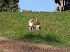 Neighborhood park shaped like a bowl with playground, forest, wooden bridges, and winding paths.