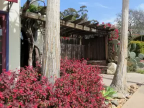 Upscale, colorful plaza in farmhouse style, with modern cafes. Kids climb on a huge log. The fire pit is fantastic at night, surrounded by eucalyptus trees.