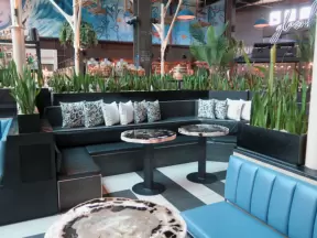 Shopping plaza with a deck offering lots of attractive public space, a trampoline for young kids, a sky deck bar, a dark public market with lights, cafes, stores and coffee shops.