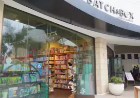 Upscale, colorful plaza in farmhouse style, with modern cafes. Kids climb on a huge log. The fire pit is fantastic at night, surrounded by eucalyptus trees.