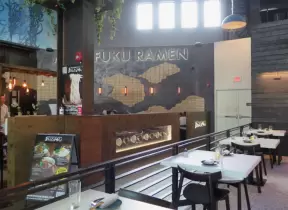 Trendy area with coffee shop, beer garden, wine bars, and cider bar, in industrial-style architecture with murals.