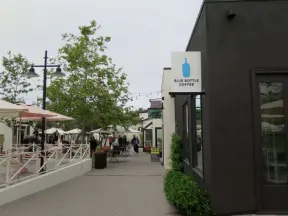 Upscale, colorful plaza in farmhouse style, with modern cafes. Kids climb on a huge log. The fire pit is fantastic at night, surrounded by eucalyptus trees.