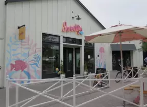 Upscale, colorful plaza in farmhouse style, with modern cafes. Kids climb on a huge log. The fire pit is fantastic at night, surrounded by eucalyptus trees.
