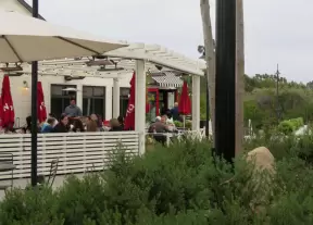 Upscale, colorful plaza in farmhouse style, with modern cafes. Kids climb on a huge log. The fire pit is fantastic at night, surrounded by eucalyptus trees.