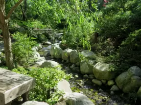 Pleasant garden with waterfall, huge lizards, boulders, pavilions with lovely circle windows and distinctive roofs, and pond, but some city noise.