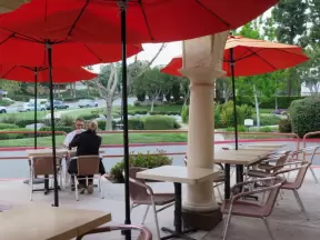 Upscale, colorful plaza in farmhouse style, with modern cafes. Kids climb on a huge log. The fire pit is fantastic at night, surrounded by eucalyptus trees.