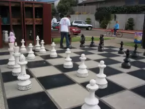 A pretty mall filled with flower pots and giant sized games, with views of the mountains and plenty of stores for kids!