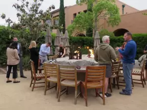 Restaurants with magical gardens, shops, fountain, open grassy areas, historical salmon-pink Spanish Revival architecture at a former naval training center.