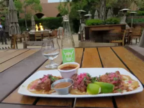 Restaurants with magical gardens, shops, fountain, open grassy areas, historical salmon-pink Spanish Revival architecture at a former naval training center.