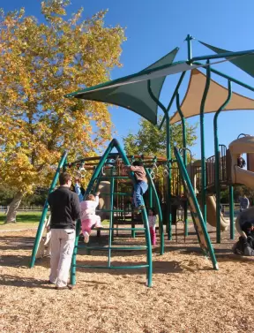 A neighborhood park with close-up views of the mountains. large lawn, playground, autumn trees, and bridge over creek to school.