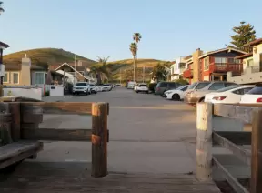 Gorgeous spot with wide pier, surfers carving the waves, whale playground, wide open attractive plaza, Pismo Beach selfie sign, and wooden promenade with views of the hills and sea.