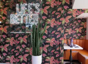 A trendy street in the middle of a sketchy neighborhood, with cafes and colorful graffiti-covered walls.
