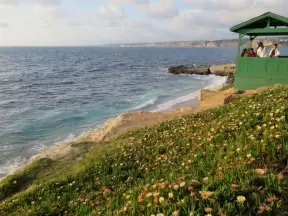 Bluff-top trail full of flowers in the spring. Lovely rugged beach and lagoon below.