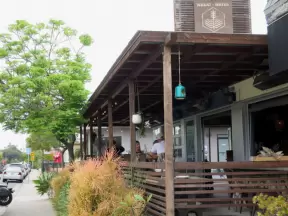 Unique redevelopment complex with man-made river, bee hive behind glass, colorful decorations, live music, and a few restaurants.