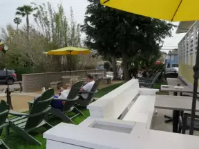 Upscale, colorful plaza in farmhouse style, with modern cafes. Kids climb on a huge log. The fire pit is fantastic at night, surrounded by eucalyptus trees.