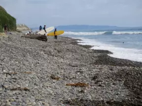 Very beautiful beach with high cliff overlooking beach of huge pebbles. Steep path lined with wildflowers.