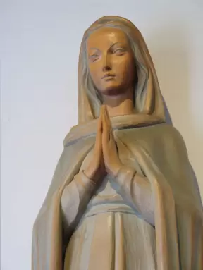 White-washed church with bell towers, rose window, Mary and contented baby Jesus sculpture.