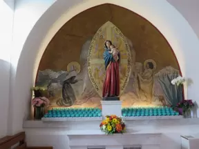 19th century white, wooden chapel perched above the sea, with entire interior painted in rich colors with scenes. Garden with sweet statues. Gorgeous lush drive.