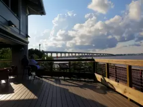 Waterfront park with amazing colors in the water- views of an island and blue-green sandbars. Plenty of benches and docks, and a playground.