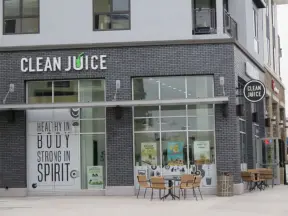 A happening spot with a sunken amphitheater by the water where kids can run in a splash pad and fountains are lit up at night. BurgerFi, Subculture Coffee, and a few restaurants.