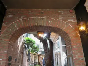 A Spanish paseo and courtyard with archways, little lights, flags, murals, lifelike statues, and fountains. At night, a magical spot!