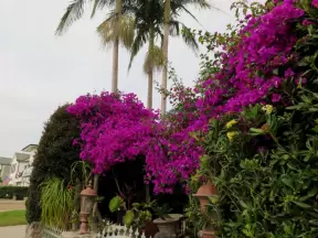 A tropical wonderland of palms, ferns, bromeliads, fountains, sculptures, rocks, ironwork gates, and pergolas, with the delightful scent of flowers filling the air.