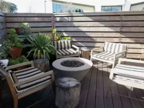 Upscale, colorful plaza in farmhouse style, with modern cafes. Kids climb on a huge log. The fire pit is fantastic at night, surrounded by eucalyptus trees.