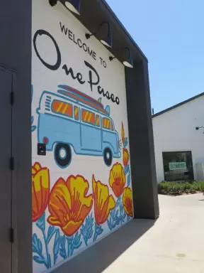 Upscale, colorful plaza in farmhouse style, with modern cafes. Kids climb on a huge log. The fire pit is fantastic at night, surrounded by eucalyptus trees.