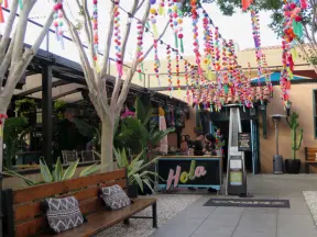 Restaurants with magical gardens, shops, fountain, open grassy areas, historical salmon-pink Spanish Revival architecture at a former naval training center.