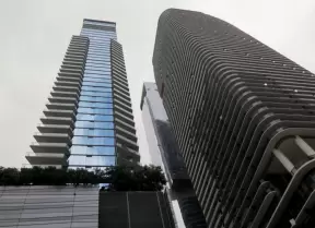A great little plaza across the street from impressive modern skyscrapers and the beach.