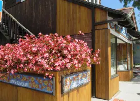 A pretty mall filled with flower pots and giant sized games, with views of the mountains and plenty of stores for kids!