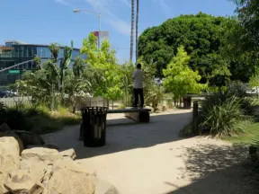 Lovely path beside a eucalyptus forest, on both sides of the creek, with workout stations, in a residential neighborhood. You can walk two miles total. Also called San Luis Ranch.