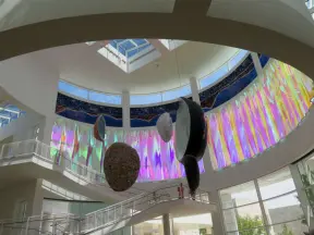 Incredible glass building with interesting activity stations for kids and modern art for parents.