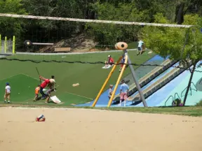 Best playground you'll ever visit! Huge slides, hillside slides, steep grass slope for cardboard sledding, cable zipline, and pretty trees to picnic under.