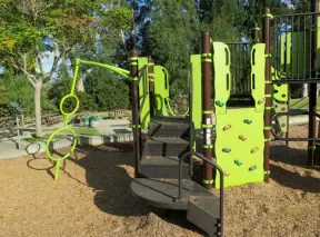Large, fenced, spread-out playground with treehouse structure, varied swings in the shade, dragonfly seesaw, egg seat, disc swing, and spinner.
