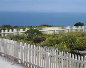 A white picket fence above stunning cliffs, sea caves, and rock formations.