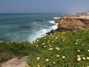 Bluff-top trail full of flowers in the spring. Lovely rugged beach and lagoon below.