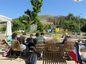 Hilly, sunny campus with tall, impressive trees and green lawns. A hands-on learning university.