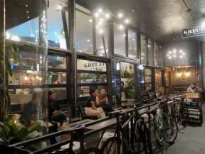 Trendy area with coffee shop, beer garden, wine bars, and cider bar, in industrial-style architecture with murals.