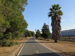 Bike path with views of hills all around, and pretty neighborhood nearby.