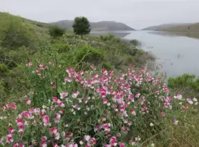 Beautiful trail slightly above the lake with sweet pea flowers in spring!
